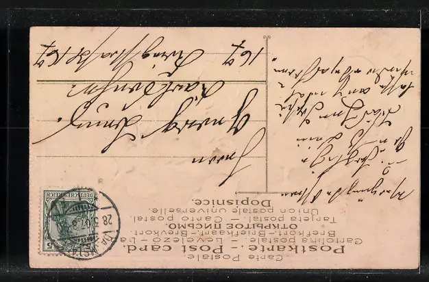 Personenbezogene Daten auf der Rückseite der Karte wurden durch blauen Textmarker unkenntlich gemacht. Die blauen Stellen sind auf die Vorderseite durchgeweicht und wirken sich negativ auf das Postkartenfoto aus