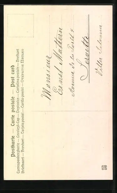 Personenbezogene Daten auf der Rückseite der Karte wurden durch blauen Textmarker unkenntlich gemacht. Die blauen Stellen sind auf die Vorderseite durchgeweicht und wirken sich negativ auf das Postkartenfoto aus