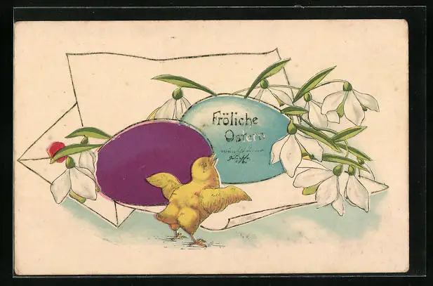 Präge-AK Osterküken mit Maiglöckchen und Ostereiern