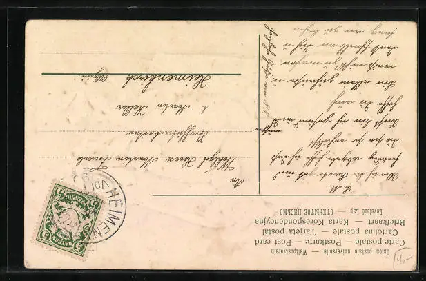 Personenbezogene Daten auf der Rückseite der Karte wurden durch blauen Textmarker unkenntlich gemacht. Die blauen Stellen sind auf die Vorderseite durchgeweicht und wirken sich negativ auf das Postkartenfoto aus