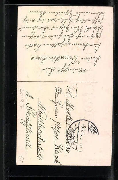 Personenbezogene Daten auf der Rückseite der Karte wurden durch blauen Textmarker unkenntlich gemacht. Die blauen Stellen sind auf die Vorderseite durchgeweicht und wirken sich negativ auf das Postkartenfoto aus