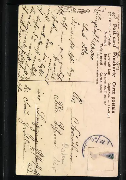 Personenbezogene Daten auf der Rückseite der Karte wurden durch blauen Textmarker unkenntlich gemacht. Die blauen Stellen sind auf die Vorderseite durchgeweicht und wirken sich negativ auf das Postkartenfoto aus