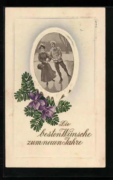 Präge-AK Paar fährt Schlittschuh auf einem See, Tannenzweig, Neujahrsgruss