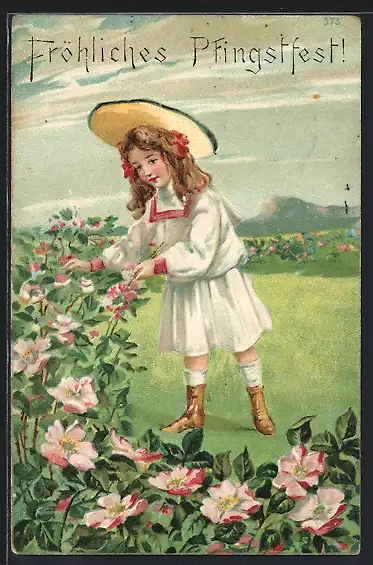Präge-AK Pfingstgruss, Mädchen pflückt Rosen