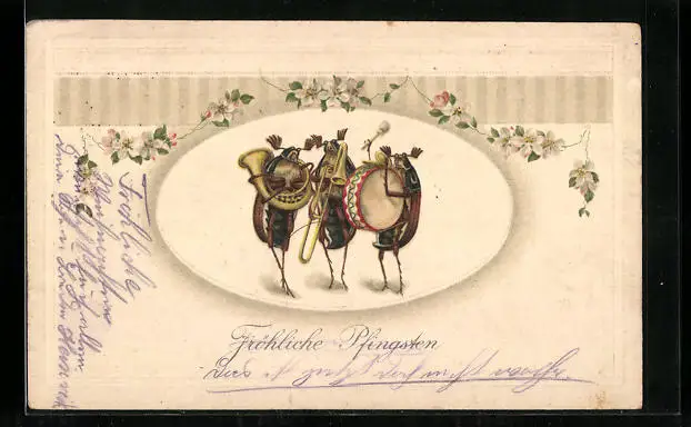 Präge-AK Pfingtsgruss, Drei musizierende Maikäfer