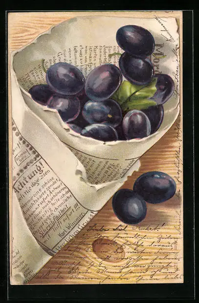 Präge-AK Pflaumen in einer Papiertüte, Schreibfaul