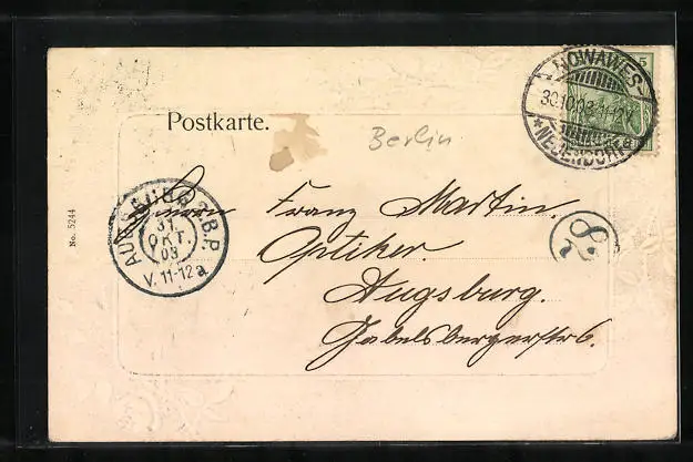 Personenbezogene Daten auf der Rückseite der Karte wurden durch blauen Textmarker unkenntlich gemacht. Die blauen Stellen sind auf die Vorderseite durchgeweicht und wirken sich negativ auf das Postkartenfoto aus