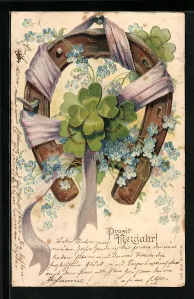 Präge-AK Prosit Neujahr, Hufeisen mit Kleeblättern