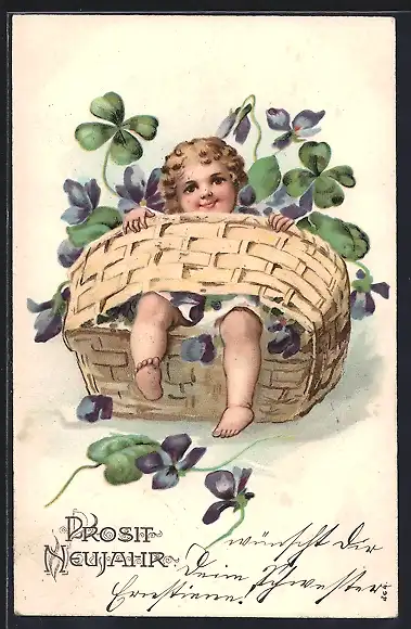 Präge-AK Prosit Neujahr, Kleines Mädchen sitzt in einem Korb mit Veilchen