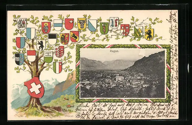 Präge-AK Ragaz, Totalansicht mit Wappen