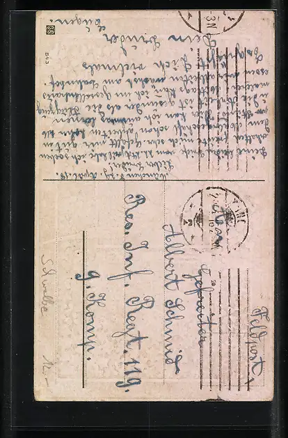 Personenbezogene Daten auf der Rückseite der Karte wurden durch blauen Textmarker unkenntlich gemacht. Die blauen Stellen sind auf die Vorderseite durchgeweicht und wirken sich negativ auf das Postkartenfoto aus