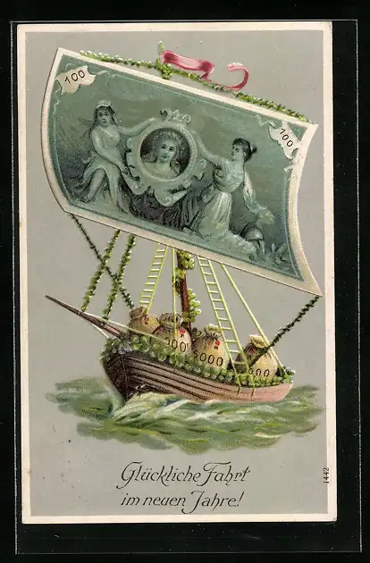 Präge-AK Schiff aus Geldschein und Münzen fährt ins neue Jahr