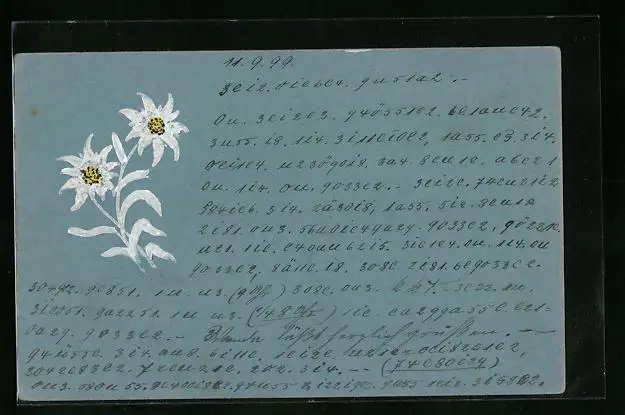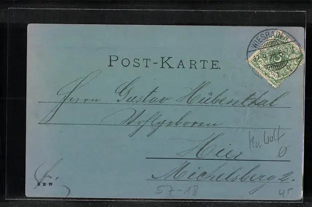 Personenbezogene Daten auf der Rückseite der Karte wurden durch blauen Textmarker unkenntlich gemacht. Die blauen Stellen sind auf die Vorderseite durchgeweicht und wirken sich negativ auf das Postkartenfoto aus