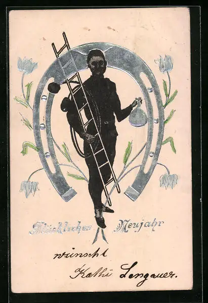 Präge-AK Schornsteinfeger vor grossem Hufeisen
