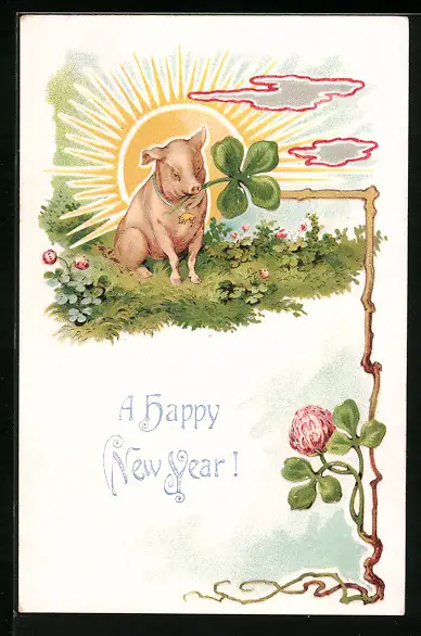 Präge-AK Schwein mit Glücksklee in der Schnauze, Neujahrsgruss