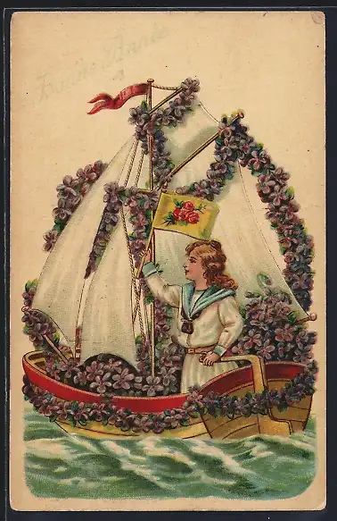 Präge-AK Segelschiff mit Veilchen geschmückt
