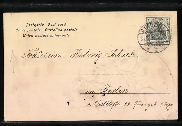 gelaufen 1902, Eckknicke oben., Bugspur oben re., guter Zustand