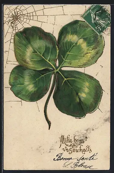 Präge-AK Spinne mit einem geprägten Kleeblatt