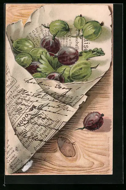 Präge-AK Stachelbeeren in Zeitungspapier eingewickelt