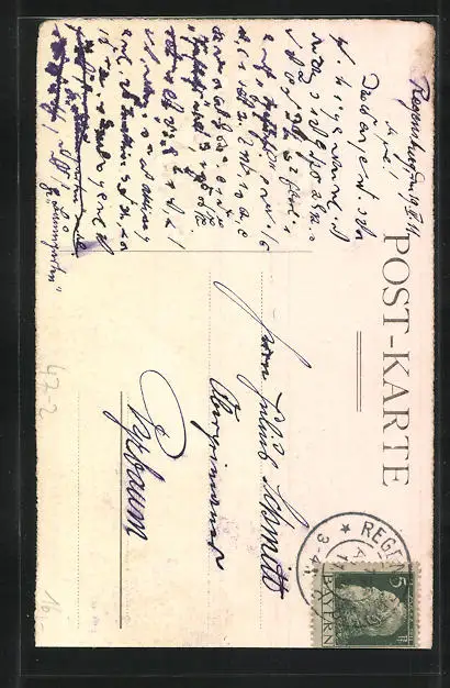 Personenbezogene Daten auf der Rückseite der Karte wurden durch blauen Textmarker unkenntlich gemacht. Die blauen Stellen sind auf die Vorderseite durchgeweicht und wirken sich negativ auf das Postkartenfoto aus