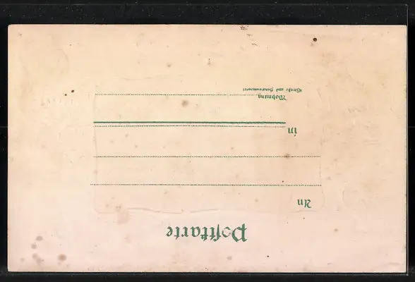 Personenbezogene Daten auf der Rückseite der Karte wurden durch blauen Textmarker unkenntlich gemacht. Die blauen Stellen sind auf die Vorderseite durchgeweicht und wirken sich negativ auf das Postkartenfoto aus