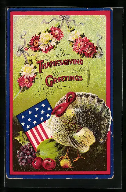 Präge-AK Thanksgiving, Truthahn mit Ernte und Blumen