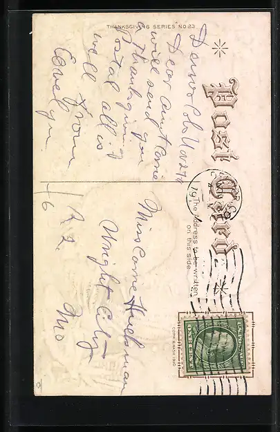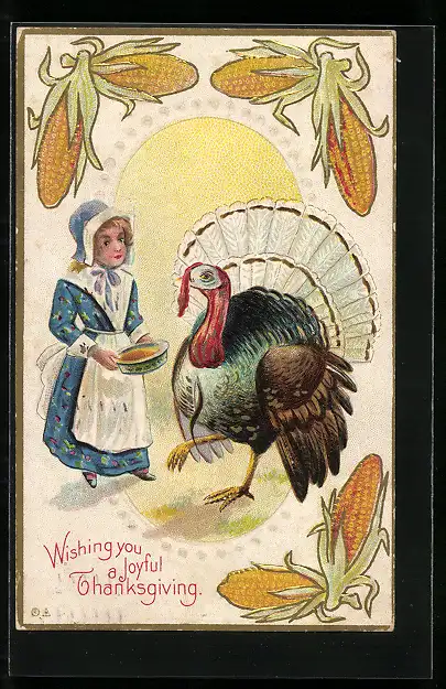 Präge-AK Thanksgiving, Truthahn mit Maiskolben und Mädchen