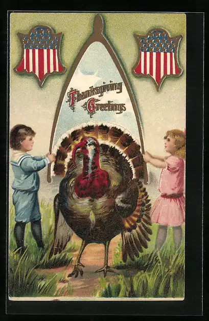 Präge-AK Thanksgiving, Zwei Kinder mit einem Truthahn
