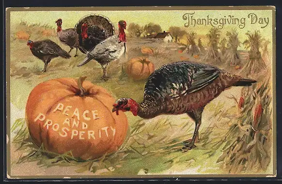 Präge-AK Truthähne mit Kürbissen auf einem Feld, Thanksgiving