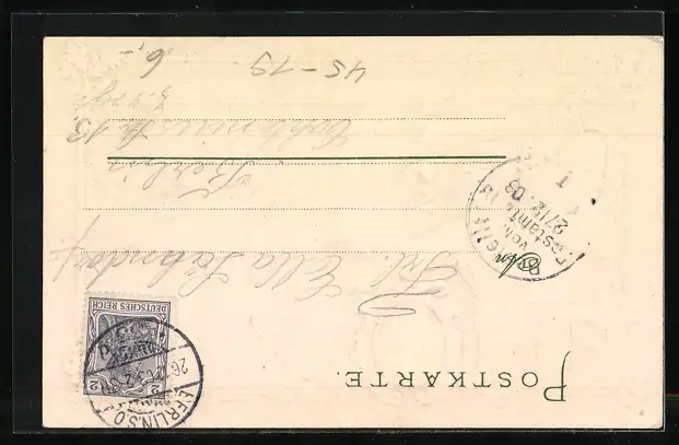 Personenbezogene Daten auf der Rückseite der Karte wurden durch blauen Textmarker unkenntlich gemacht. Die blauen Stellen sind auf die Vorderseite durchgeweicht und wirken sich negativ auf das Postkartenfoto aus