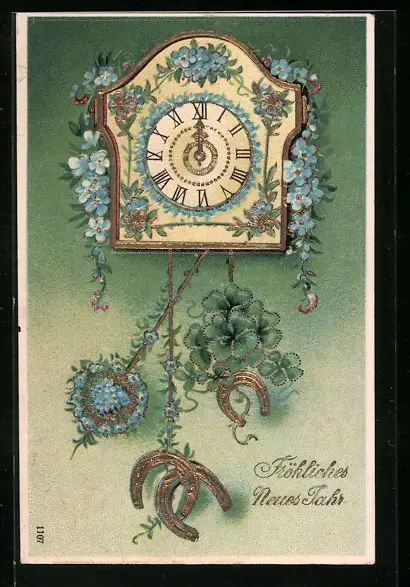 Präge-AK Uhr zu Mitternacht mit Hufeisen und Kleeblättern