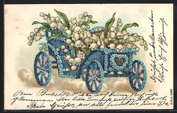 Präge-AK Vergissmeinnicht-Automobil mit Maiglöckchen