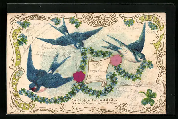 Präge-AK Vier Schwalben mit Brief und Vergissmeinnicht-Banderolen