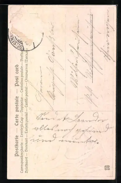 alte Ansichtskarte, gelaufen, Briefmarke tw. entfernt, rückseitig Oberflächenschaden, Eckknick re. oben, minimaler Einriss re. oben, guter Zustand