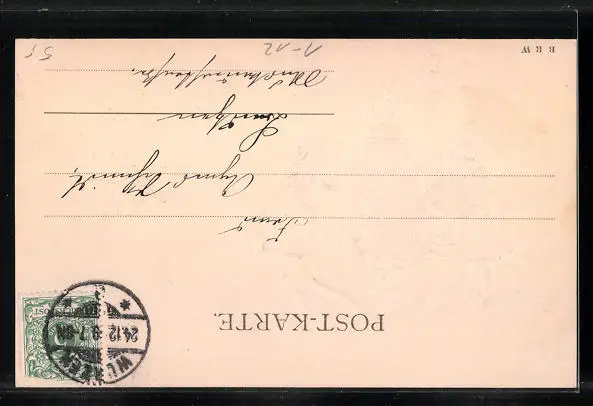 Personenbezogene Daten auf der Rückseite der Karte wurden durch blauen Textmarker unkenntlich gemacht. Die blauen Stellen sind auf die Vorderseite durchgeweicht und wirken sich negativ auf das Postkartenfoto aus