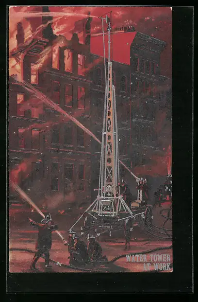 Präge-AK Water Tower at Work, Feuerwehrleute löschen einen Brand