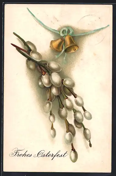 Präge-AK Weidenkätzchen mit Glöckchen, Ostergruss
