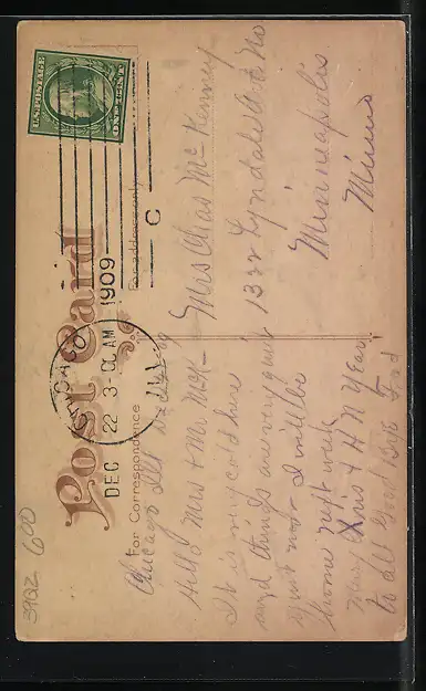 Personenbezogene Daten auf der Rückseite der Karte wurden durch blauen Textmarker unkenntlich gemacht. Die blauen Stellen sind auf die Vorderseite durchgeweicht und wirken sich negativ auf das Postkartenfoto aus