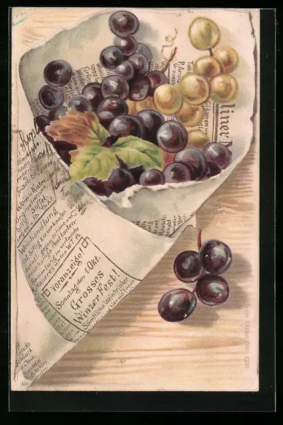 Präge-AK Weintrauben in Zeitungspapier eingewickelt