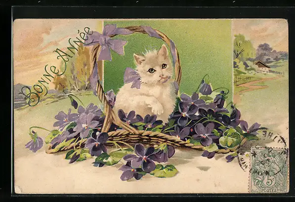 Präge-AK Weisse Katze im Korb mit Veilchen, Neujahrsgruss