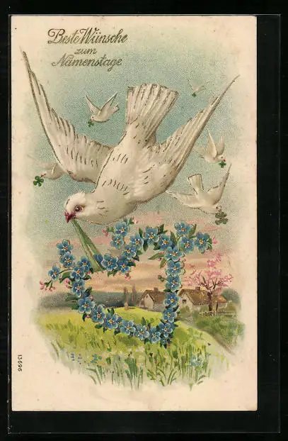 Präge-AK Weisse Schwalbe trägt Herz aus Vergissmeinnicht