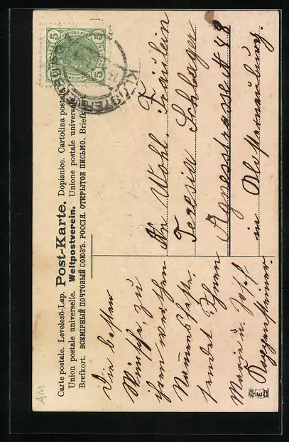 Personenbezogene Daten auf der Rückseite der Karte wurden durch blauen Textmarker unkenntlich gemacht. Die blauen Stellen sind auf die Vorderseite durchgeweicht und wirken sich negativ auf das Postkartenfoto aus