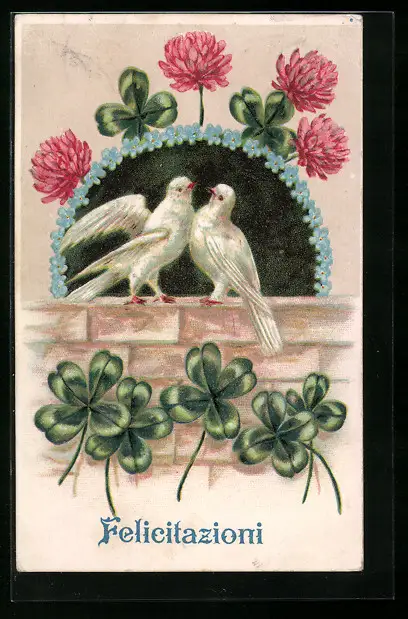 Präge-AK Weisses Taubenpaar und Glücksklee