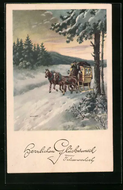 Präge-AK Winterliche Landschaft mit einer Postkutsche, Neujahrsgruss