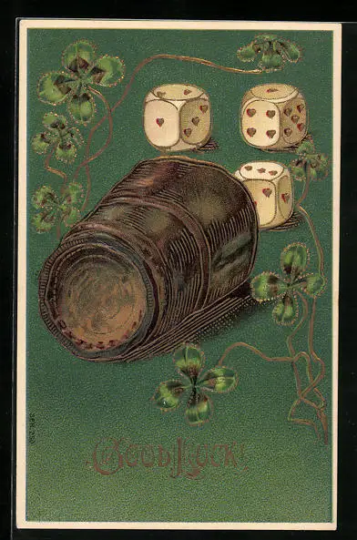 Präge-AK Würfelbecher mit Würfeln und Kleeblättern