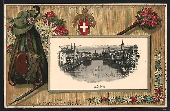 Präge-AK Zürich, Teilansicht mit Flusspartie, Passepartout mit Wanderausrüstung