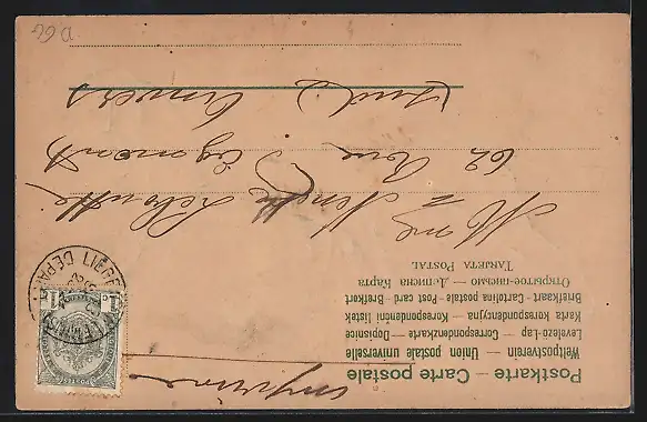 Personenbezogene Daten auf der Rückseite der Karte wurden durch blauen Textmarker unkenntlich gemacht. Die blauen Stellen sind auf die Vorderseite durchgeweicht und wirken sich negativ auf das Postkartenfoto aus