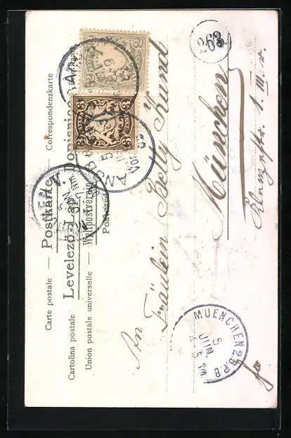 Personenbezogene Daten auf der Rückseite der Karte wurden durch blauen Textmarker unkenntlich gemacht. Die blauen Stellen sind auf die Vorderseite durchgeweicht und wirken sich negativ auf das Postkartenfoto aus