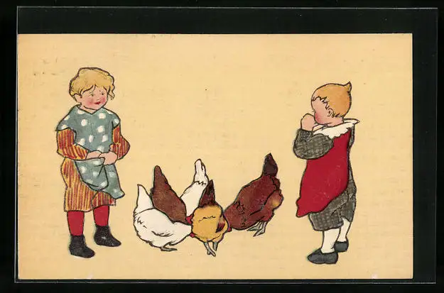 Präge-AK Zwei Kinder mit einer Hühnerschar