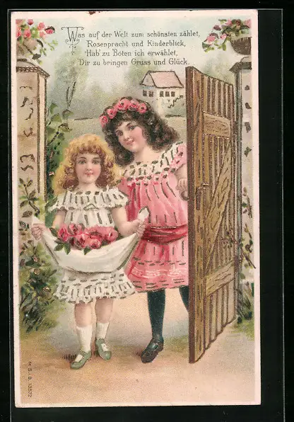 Präge-AK Zwei Mädchen bringen Rosen